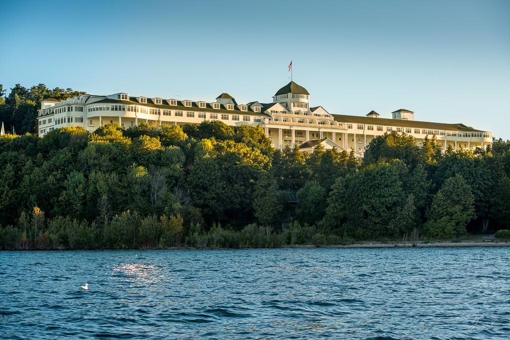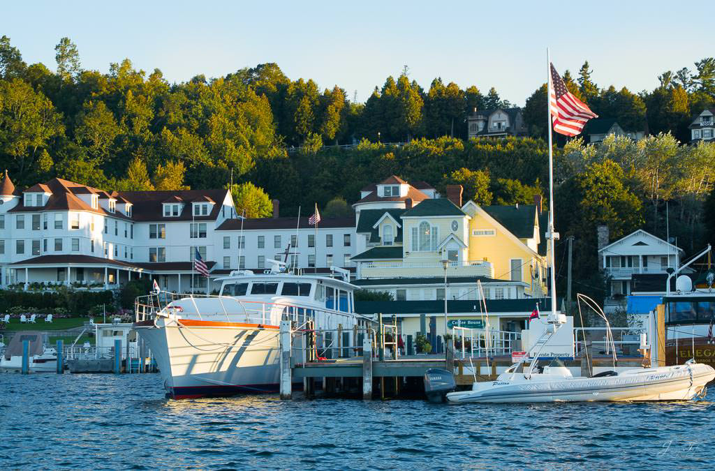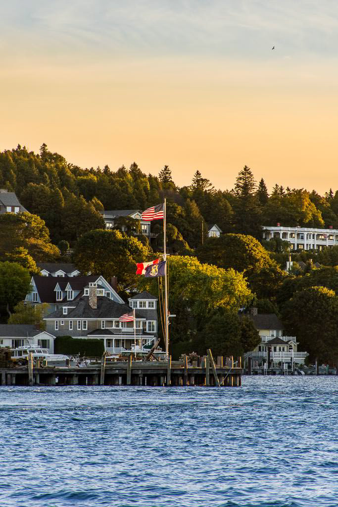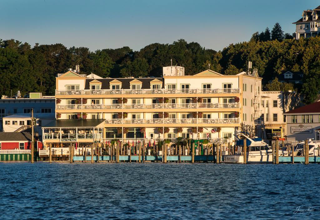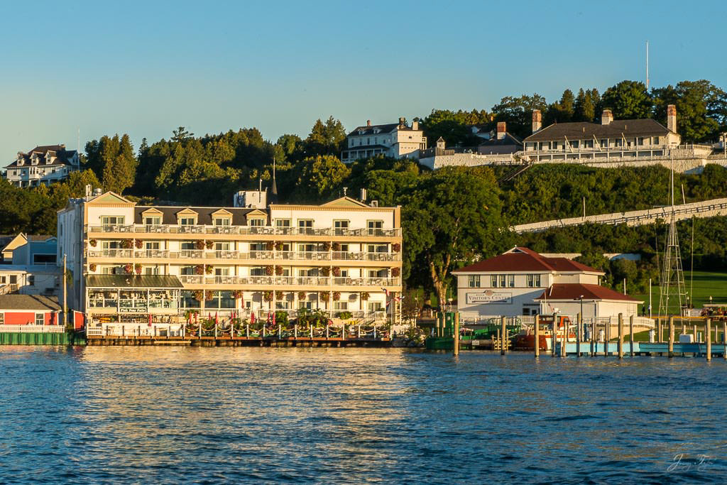 Mackinac Island sunrise from the water, Mission Point resort with the golden sunlight on the buildings