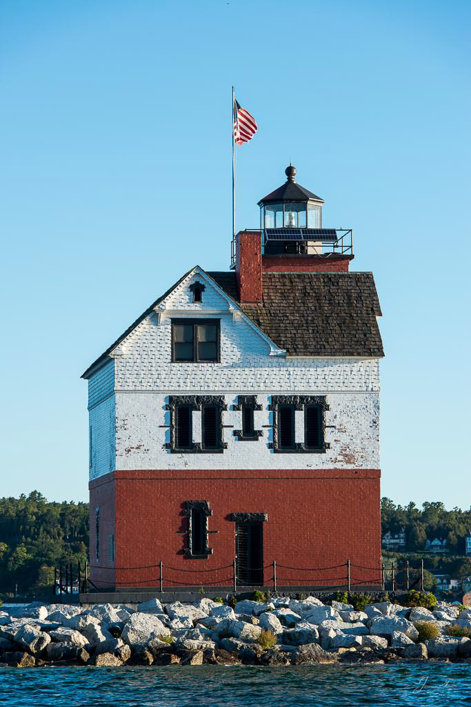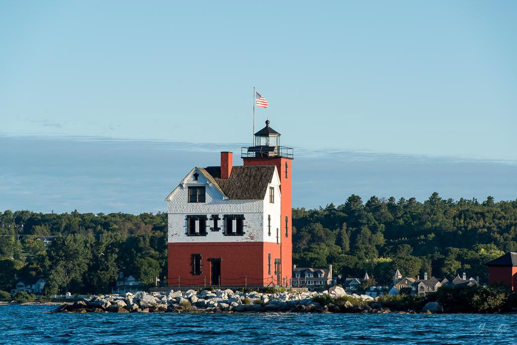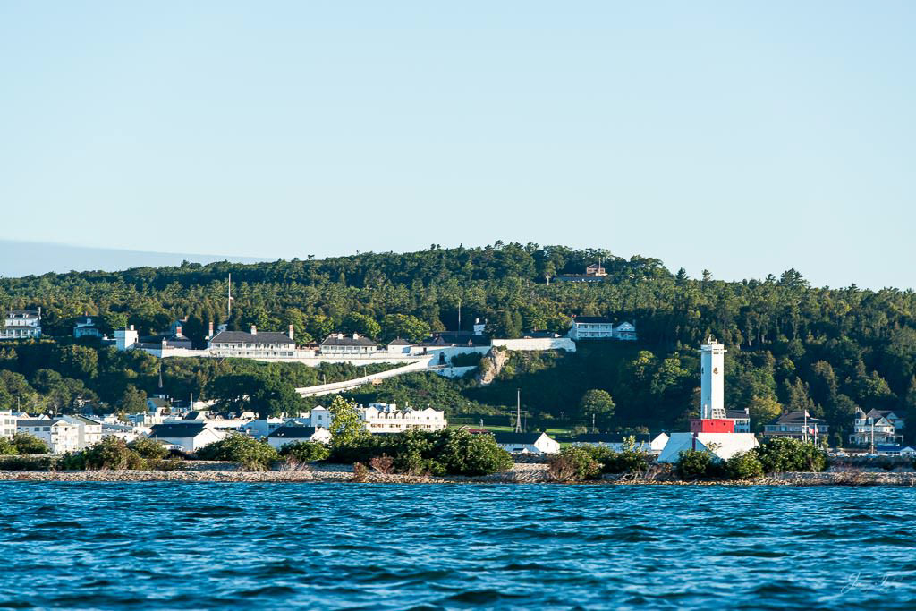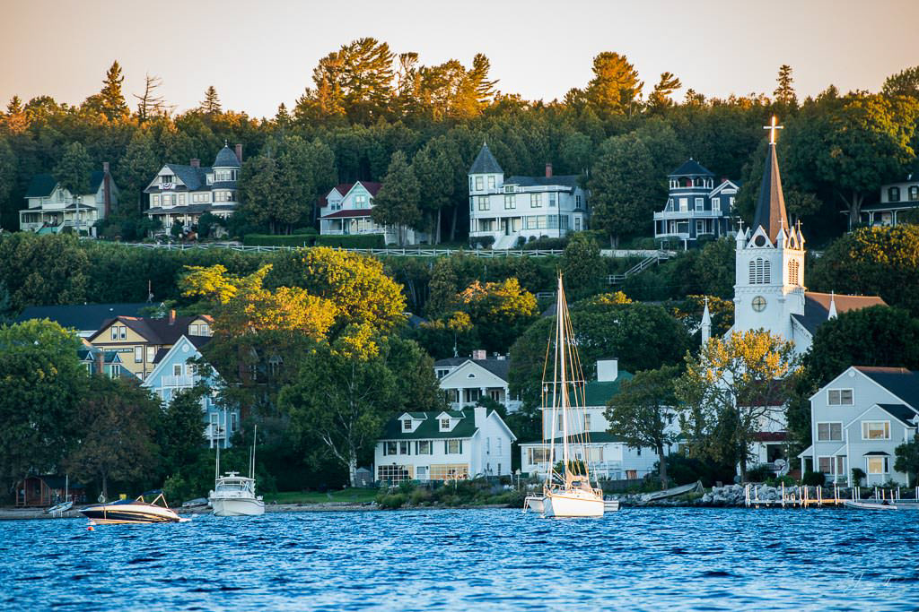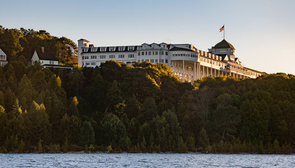 Mackinac Island sunrise from the water, Mission Point resort with the golden sunlight on the buildings