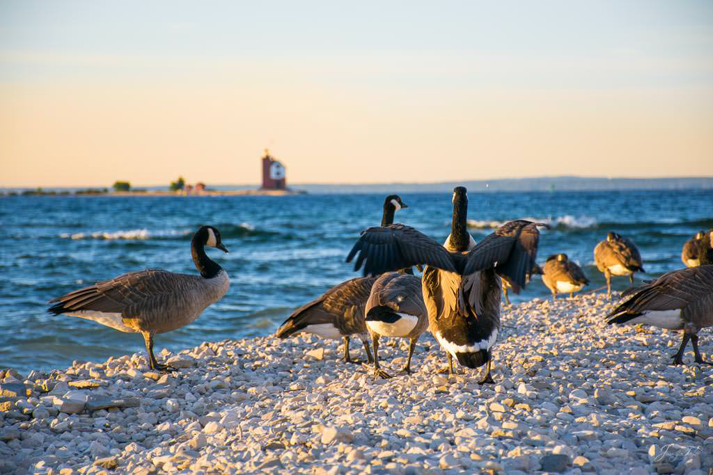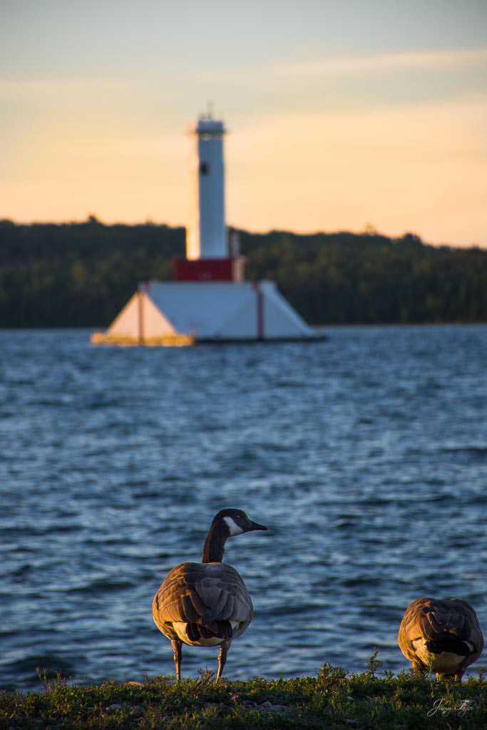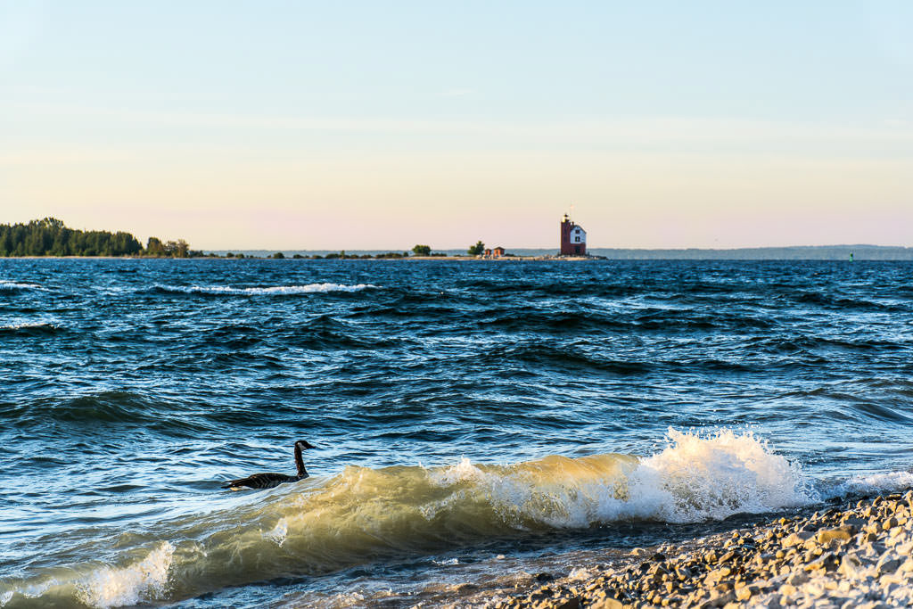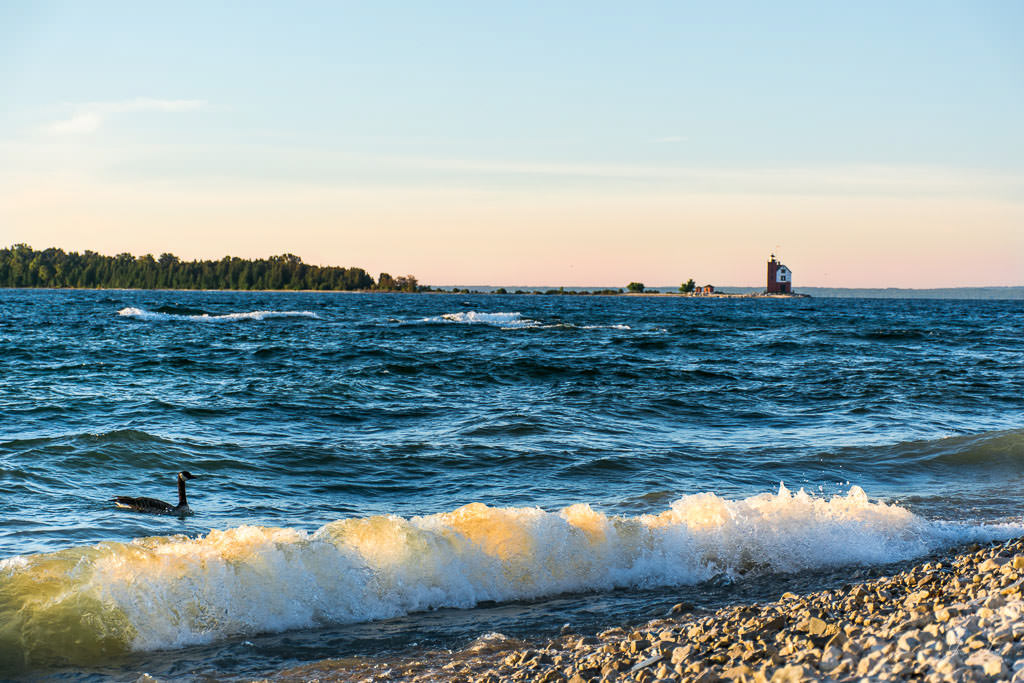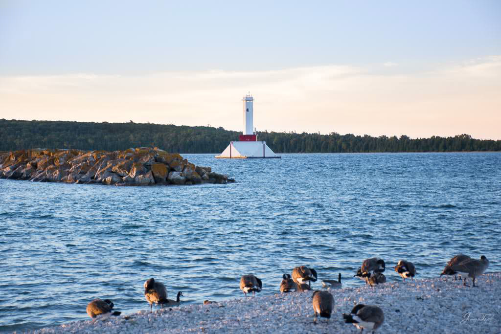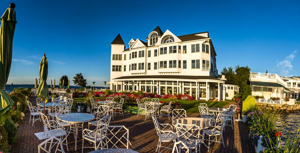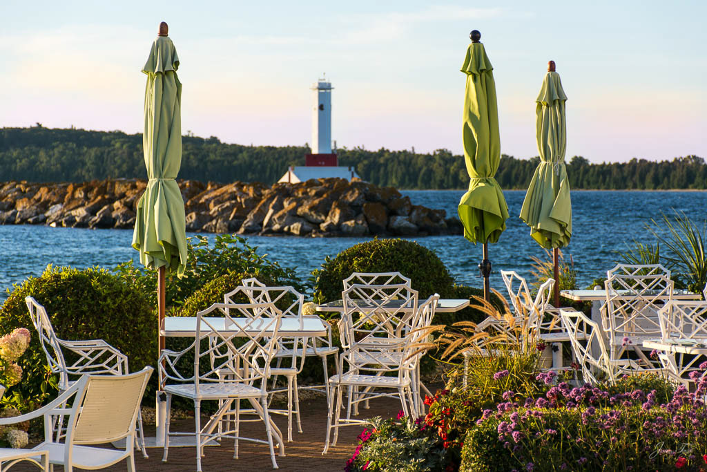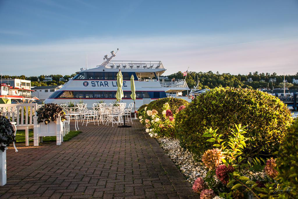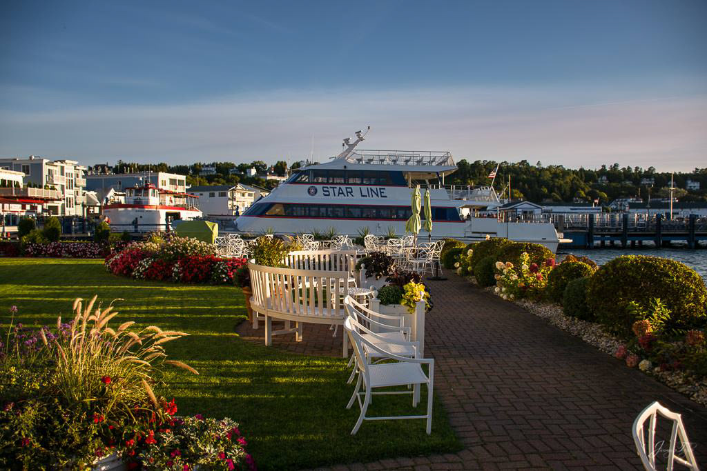 Mackinac Island sunrise from the water, Windermere Hotel and Windermere Park