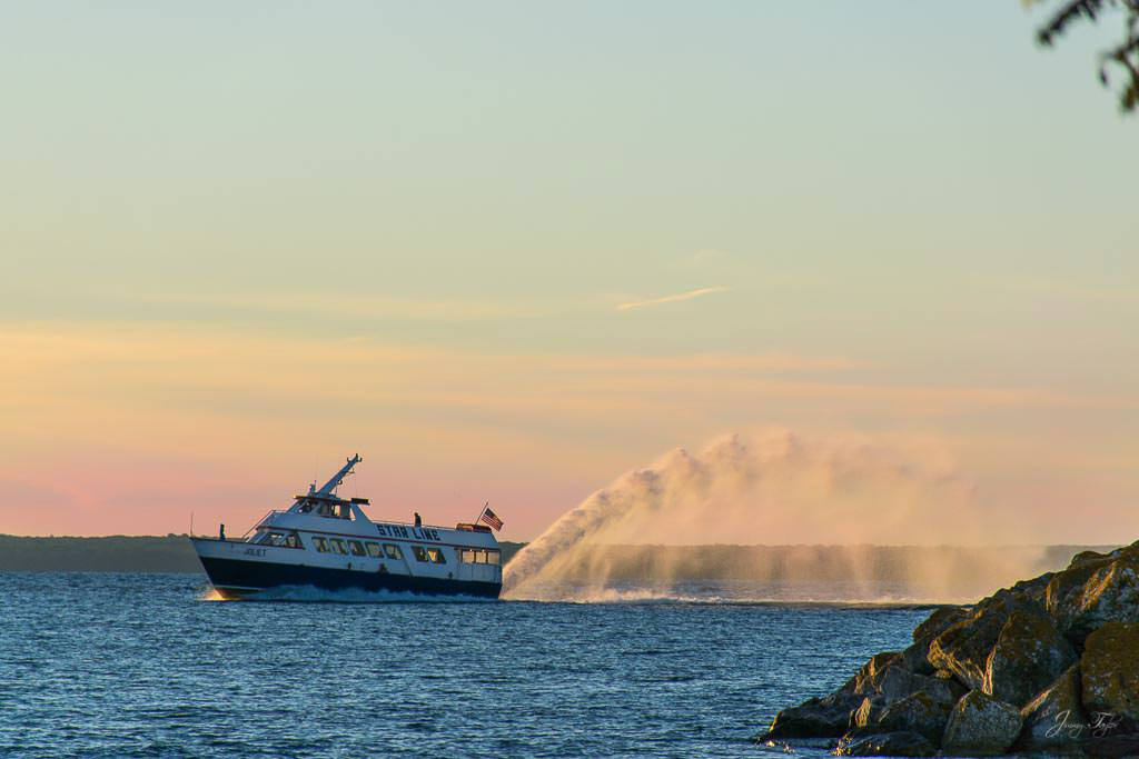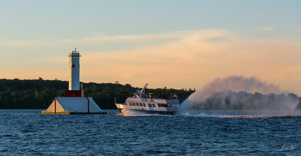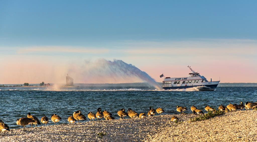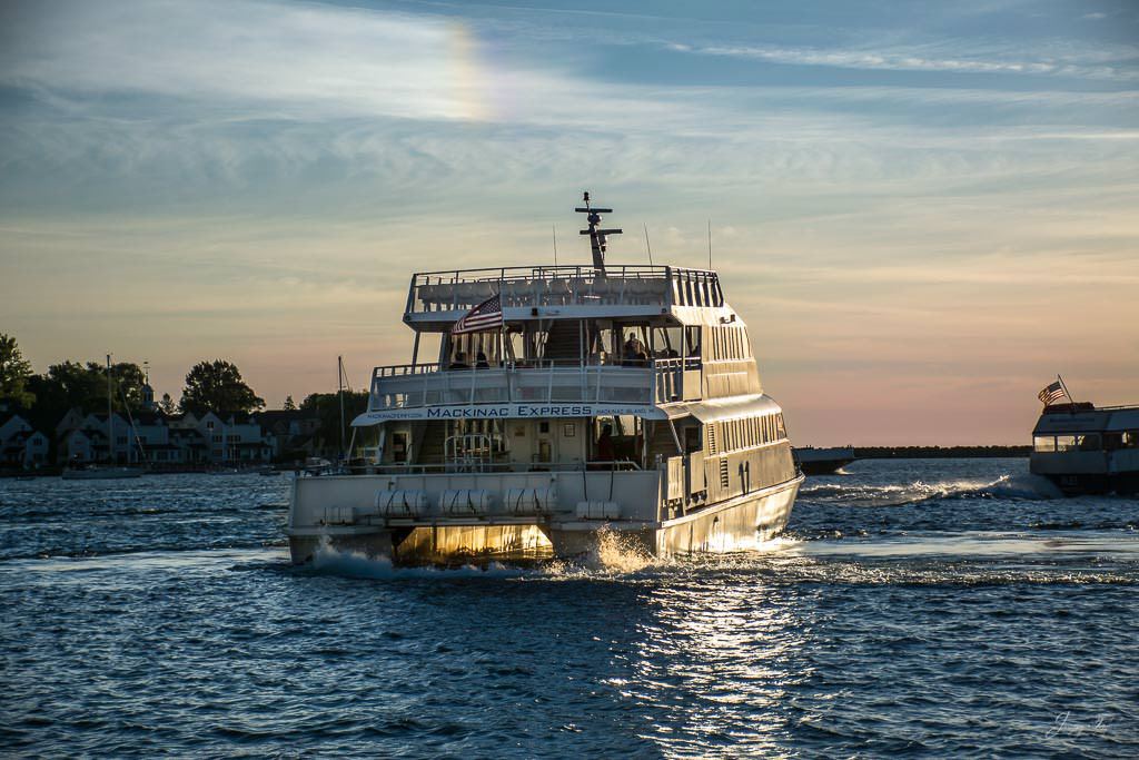 Mackinac Island sunrise with approaching ferry in the distance