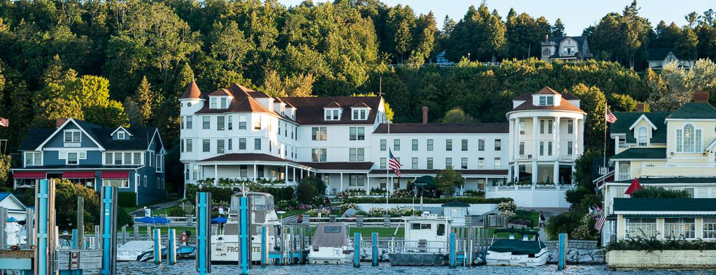 Mackinac Island sunrise from the water, Iroquois Hotel and other waterfront properties